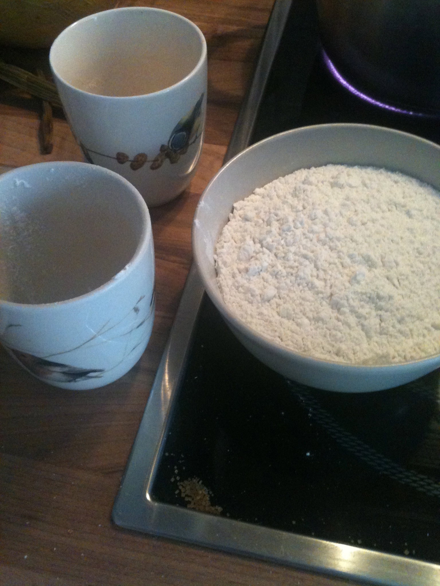 Don’t have any measuring cups in my new kitchen either so was just winging it really with online conversions from grams to tablespoons and grams to cups and guessing that these mugs are about a cup size.