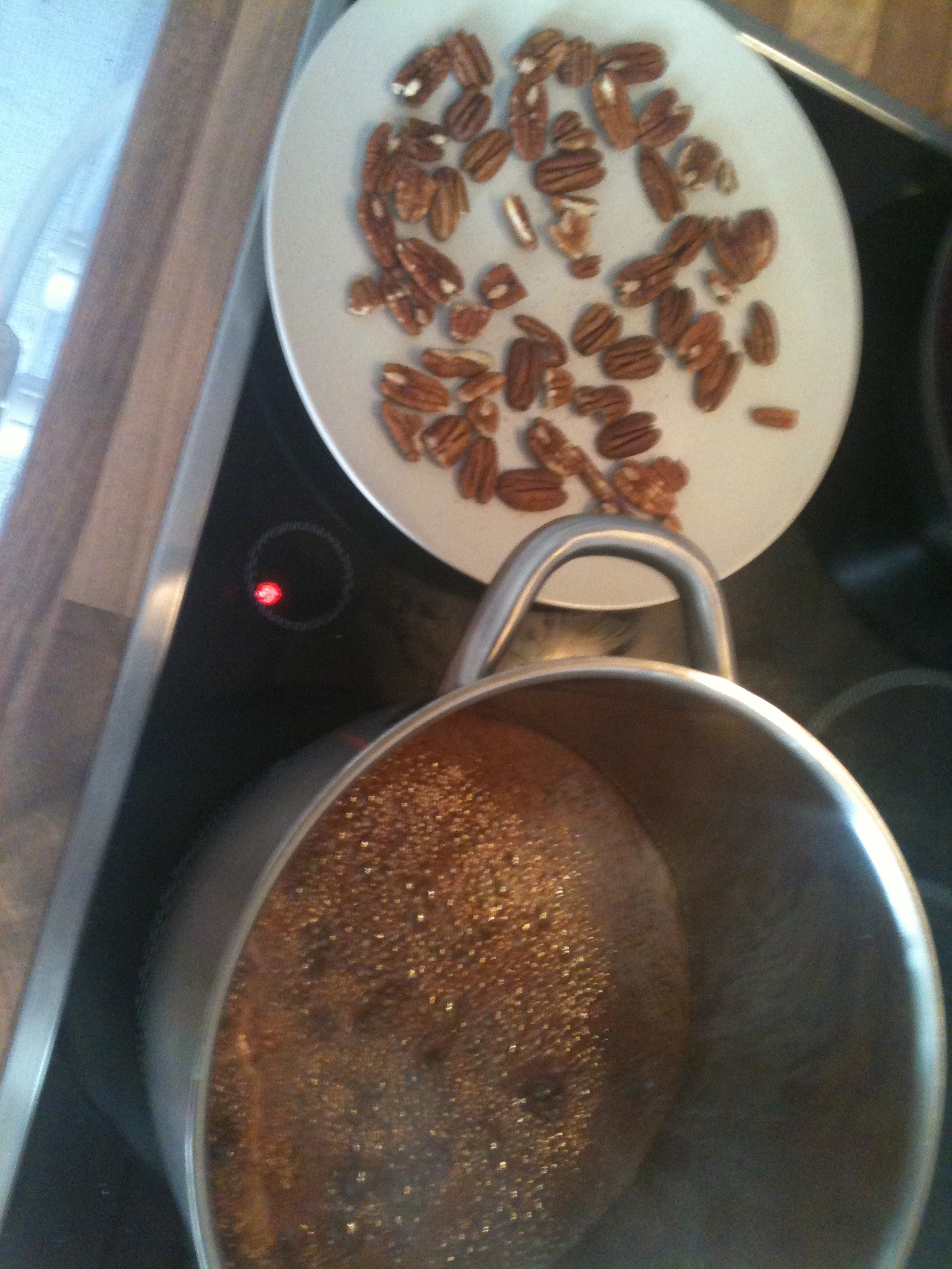 Yes. I know, you can tell, I burnt it again! At this stage though I had 5 or so hours of cake making behind me and just wanted it finished so I strew my pecans on a lightly greased plate (no slice trays either) and convinced myself that the toffee would be fine.