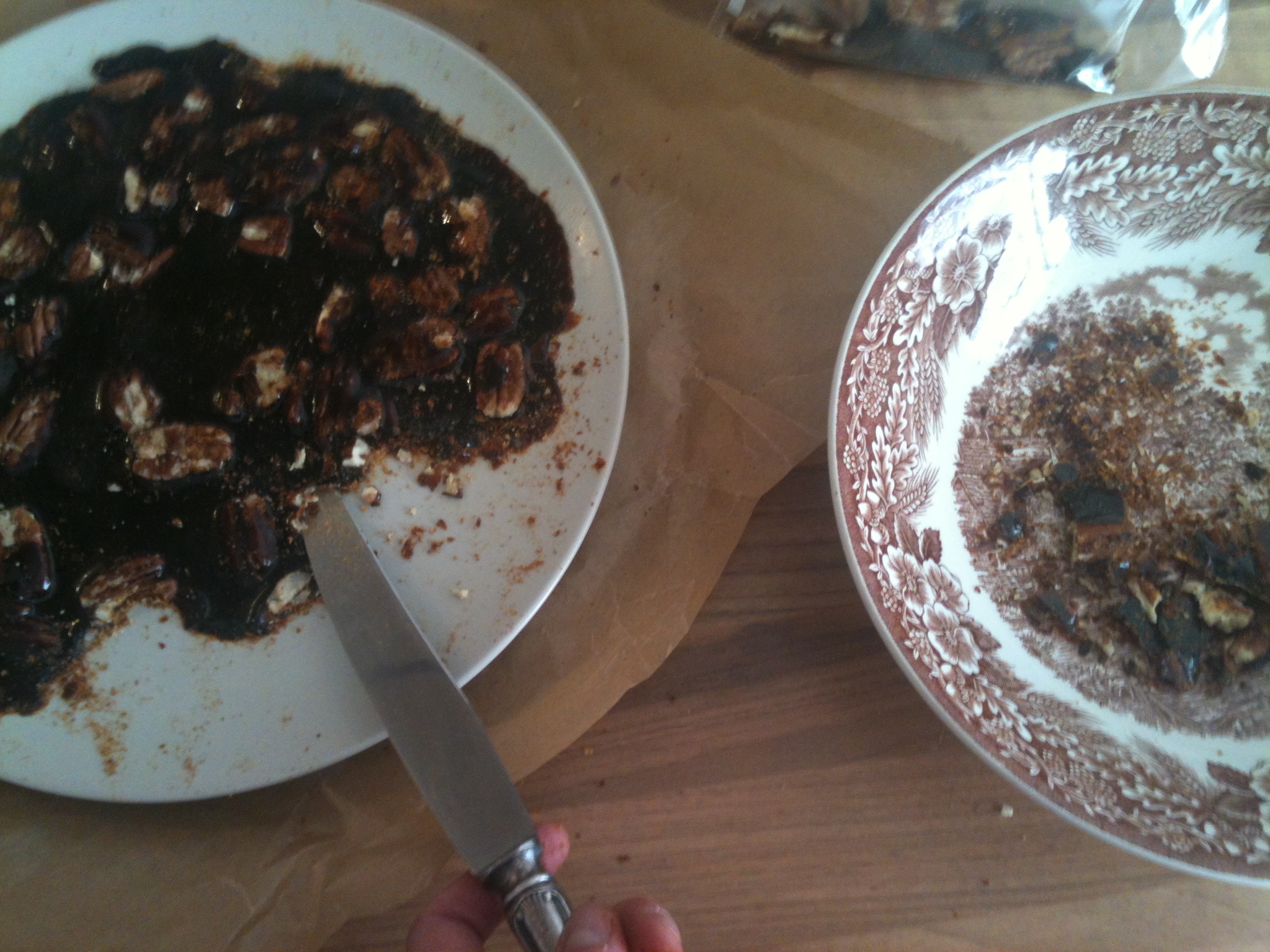 When the toffee was finally set I had two major problems. 1. I couldn’t get it off the plate and 2. It tasted burnt. STILL I convinced myself it would be fine and started beating it to a pulp in a plastic bag with a rolling pin. After a good half hour of scraping and beating and bashing and cries of frustration I finally gave up. All the beating with a rolling pin in the world was not going to fix this toffee. What a terrible waste of Pecans! (I rescued what I could)